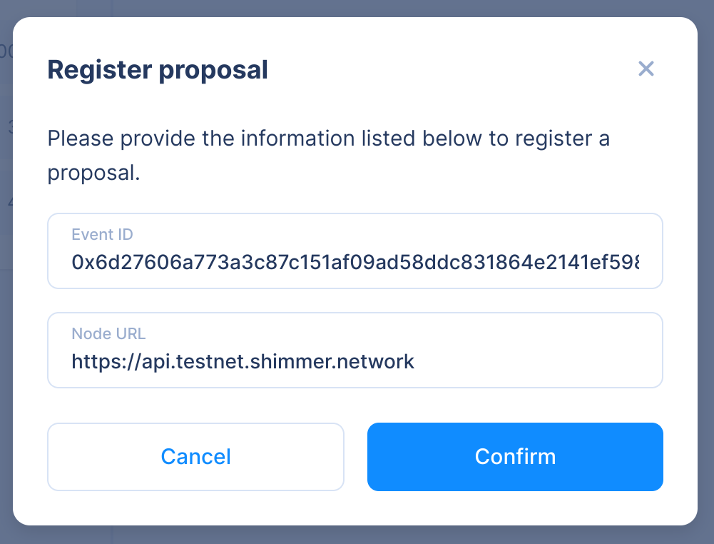 bloom://governance/addProposal?eventId=0x6d27606a773a3c87c151af09ad58ddc831864e2141ef598075dc24be5668ca7f7f&nodeUrl=https://api.testnet.shimmer.network